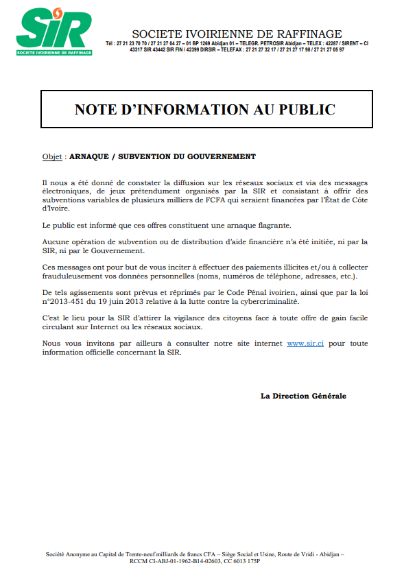 La SIR, Société ivoirienne de raffinage, a été créée le 03 octobre 1962 par le gouvernement ivoirien avec le concours de groupes pétroliers internationaux. Elle assure le raffinage du pétrole brut et la distribution de produits pétroliers en Côte d’Ivoire et dans le reste du monde.